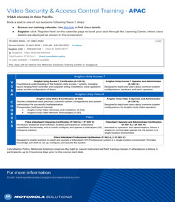 Training resources for critical communications, command center, body cameras, in-car video, LPR cameras, cybersecurity, Avigilon and Pelco video security and access control products and services.