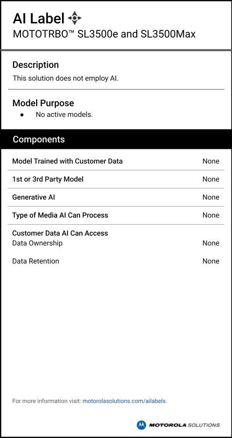AI labels provide information on if and how MOTOTRBO SL3500e and SL3500Max leverage artificial intelligence. Learn more