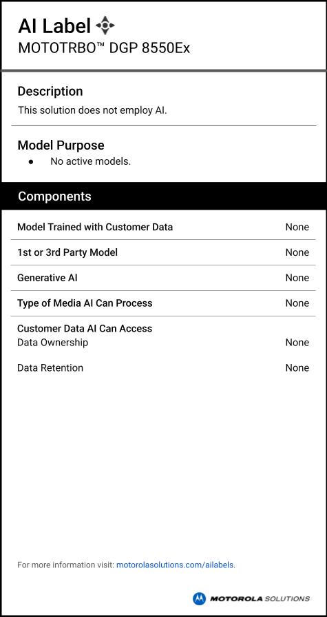 AI labels provide information on if and how MOTOTRBO DGP 8550Ex leverages artificial intelligence. Learn more