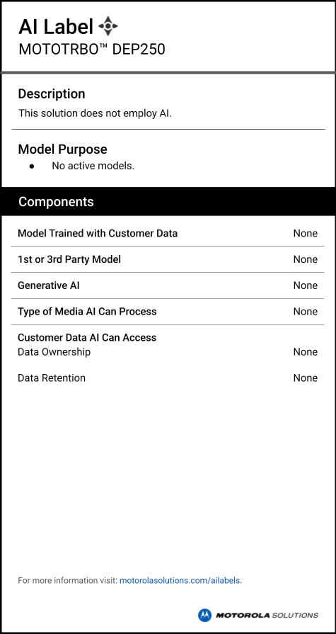 AI labels provide information on if and how MOTOTRBO DEP250 leverages artificial intelligence. Learn more