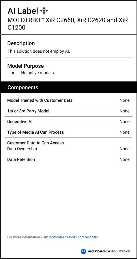 AI labels provide information on if and how MOTOTRBO XiR C2660, XiR C2620 and XiR C1200 leverages artificial intelligence. Learn more