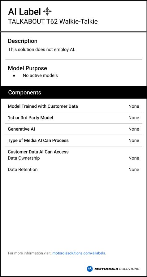 AI labels provide information on if and how TALKABOUT T62 leverages artificial intelligence. Learn more