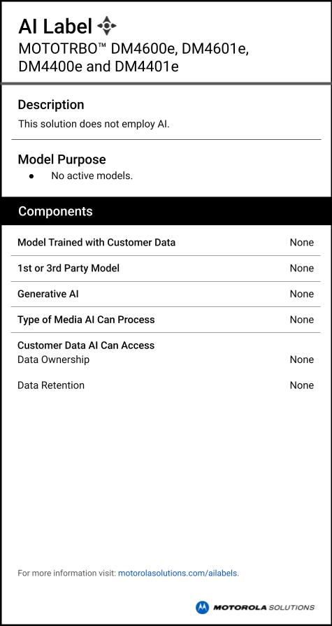 AI labels provide information on if and how MOTOTRBO DM4600e, DM4601e, DM4400e and DM4401e leverage artificial intelligence. Learn more