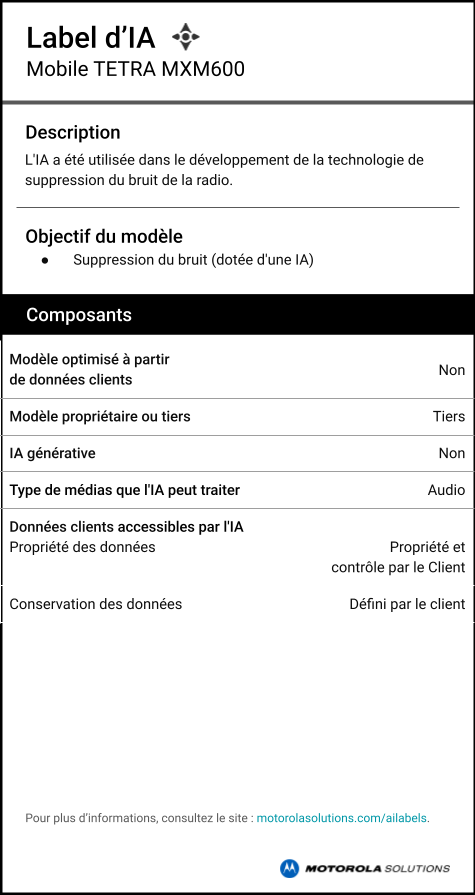 La clarté des communications radio est essentielle pour transmettre des messages vitaux. La technologie de réduction du bruit, obtenue grâce au Machine Learning, est intégrée au MXM600 pour supprimer les bruits de fond et améliorer la clarté des appels, afin que les utilisateurs puissent entendre et être entendus, même dans des conditions bruyantes.