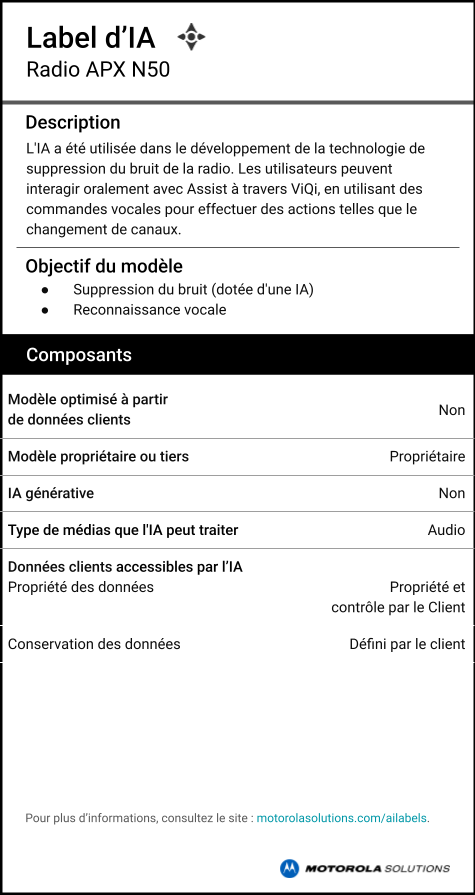 L'APX N50 est une radio compacte et résistante, conçue pour offrir aux primo-intervenants, aux équipes d'assistance et administratives de la sécurité publique des communications sécurisées sur lesquelles ils peuvent compter sur le terrain. Simple à utiliser, elle est dotée un son puissant, du cryptage matériel MACE et d'outils de programmation par lots efficaces pour vous permettre de rester connectée et de collaborer, partout et à tout moment.