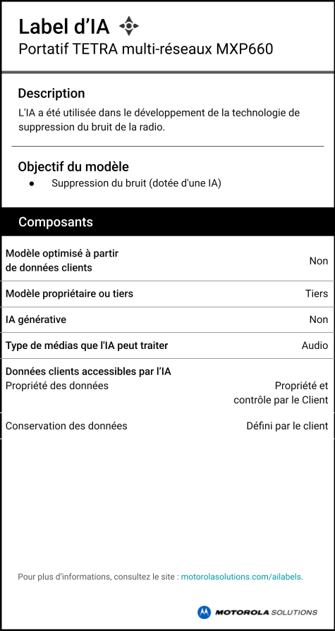 Robuste et léger, le MXP600 est facile à porter et à utiliser. Il est doté d’une technologie de suppression du bruit par IA. Il peut utiliser les réseaux haut débit LTE/Wi-Fi et votre passerelle DIMETRA Connect, afin que vos utilisateurs restent connectés à leurs fonctionnalités TETRA en dehors de la couverture TETRA. Le MXP660 réduit votre coût total de possession, grâce à l’OTAP et à sa compatibilité avec la plupart des accessoires du MXP600.