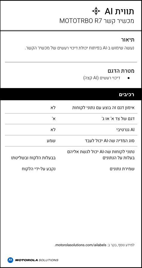 יותר תכונות במכשיר מעוצב. MOTOTRBO R7 כולל: צג QVGA בגודל 2.4 אינץ' 320X240 פיקסל; מיקרופונים קדמיים ואחוריים לביטול רעשים; רמקול קדמי עוצמתי מספק שמע חד וברור; Wi-Fi 2.4/5 GHz ו- Bluetooth 5.1 לתקשורת מהירה ומאובטחת; סוללה דקה עם חיי סוללה ארוכים לזמני שיחה ארוכים יותר; כפתור חירום גדול בעיצוב ארגונומי.