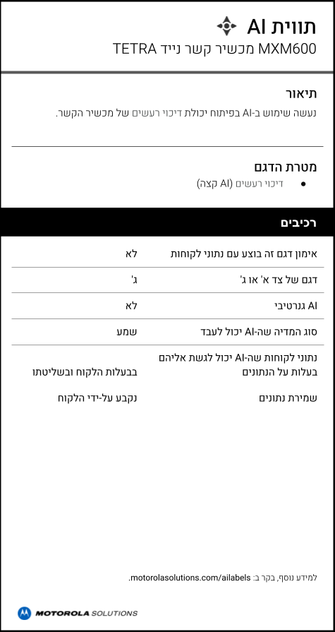 טכנולוגיית בינה מלאכותית (AI) שימשה לאימון מכשיר הקשר MXM600 כדי לסייע בהפחתת רעשים.
