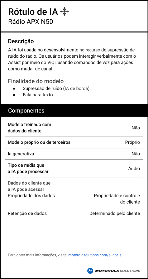 O APX N50 é um rádio de formato fino, mas resistente, projetado para oferecer segurança e confiança na comunicação entre socorristas, equipes de suporte e administração da segurança pública que trabalham em campo. Ele tem layout simples, áudio alto, criptografia de hardware MACE e recursos eficientes de programação em lote para manter a conexão e a colaboração da sua frota, a qualquer hora, em qualquer lugar.